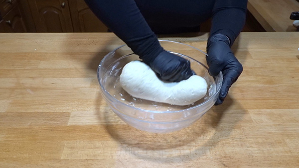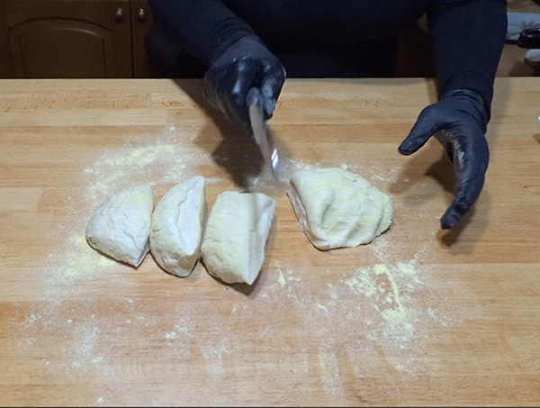 Βήμα 7: Κάντε ένα μπαστούνι και κόψτε σε 4 ίσα κομμάτια. Αν έχετε ζυγαριά. ζυγίστε την ζύμη σας και διαιρέστε στα 4, λογικά θα σας βγεί περίπου 220 γρ. το κάθε κομμάτι ζύμης. Ζυμώστε το κάθε κομμάτι.