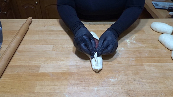Βήμα 10: Ήρθε η ώρα να κλείσουμε τα πεϊνιρλί. Παίρνουμε τις δύο άκρες και τις ενώνουμε τσιμπώντας…τόσο απλά! Μην σας απασχολεί που θα γίνει μυτερό στην ένωση, με το φούσκωμα θα γίνει ομοιόμορφο. Αν δεν ενώνονται εύκολα, βρέξτε τα δάχτυλά σας.
