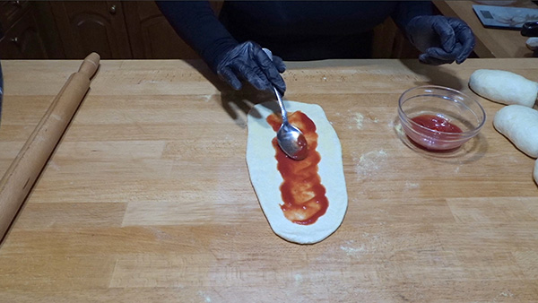 Βήμα 9: Βάλτε σάλτσα κατά μήκος της ζύμης, απλώστε ομοιόμορφα, βάλτε τα τυριά, μετά τα αλλαντικά και τέλος τα λαχανικά αν επιλέξετε να βάλετε.