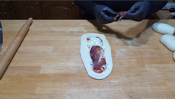 Βήμα 8: Πάρτε ένα κομματι ζύμης, ρίξτε πάνω λίγο αλεύρι και με ένα πλάστη ή με τα χέρια σας, ανοίξτε ορθογώνια/μακρόστενα την ζύμη.