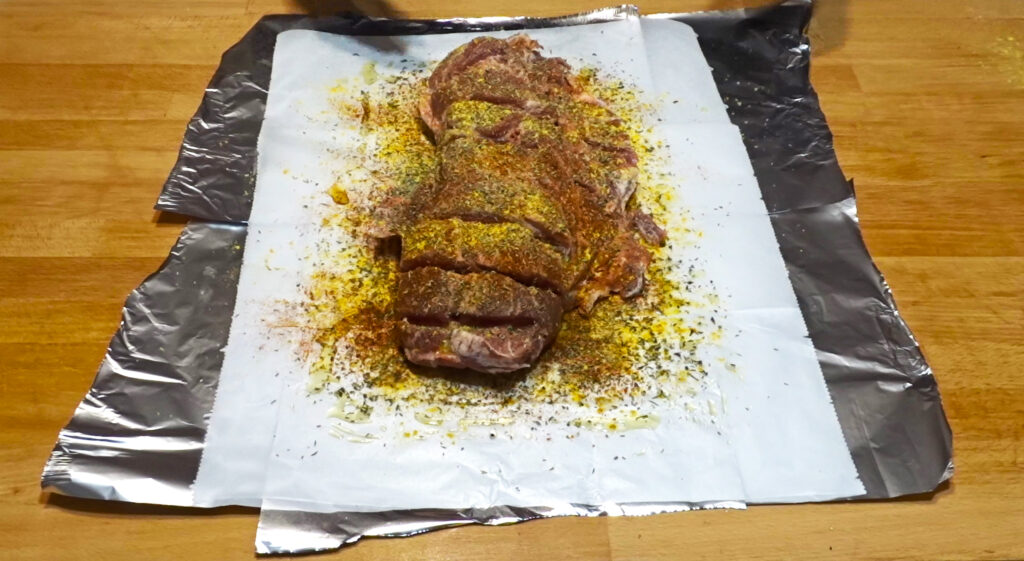 Βήμα 4: Χαράξτε το κρέας, λαδώστε το παντού και ρίξτε όλα τα μπαχαρικά. Μετά, αλείψτε με τα χέρια σας το κρέας για να πάνε τα μπαχαρικά παντού.